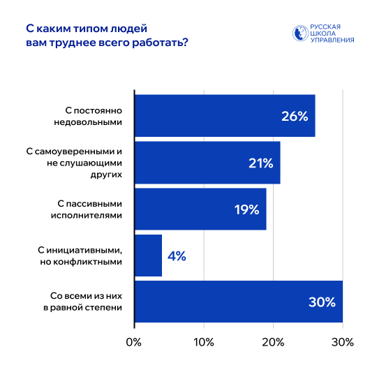 Больше всего руководители устают от сотрудников, которые постоянно чем-то недовольны — так ответили 26% участников опроса. 21% респондентов заявили, что им тяжело работать с самоуверенными коллегами, не готовыми слушать других. 19% отметили пассивных исполнителей, которые не проявляют инициативу. Треть управленцев (30%) признались, что им одинаково трудно со всеми этими типами сотрудников.