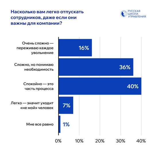 Многие руководители тяжело переносят увольнения: 56% признались, что им сложно отпустить сотрудника, 40% реагируют на это спокойно, 7% — легко, а 1% совсем не придает этому значения.